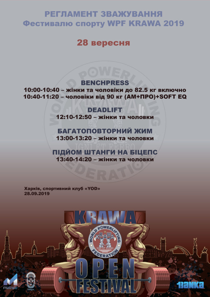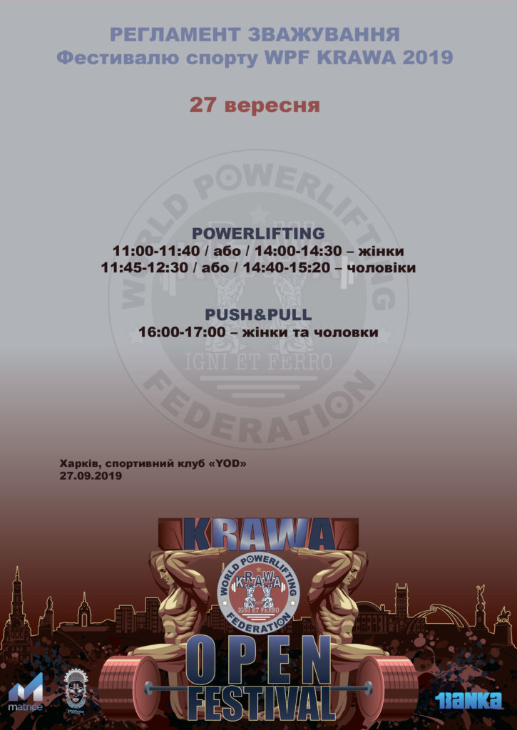 Федерация пауэрлифтинга Украины WPF-KRAWA приглашает всех спортсменов 28-29-го сентября, для участия в соревнованиях по пауэрлифтингу, Push & Pull, жиму штанги лежа, становой тяги, многоповторному жиму, приседанию со штангой и Strict Curl.